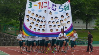 吹奏楽部の演奏のもと、各クラスがクラス旗をかかげて行進しました。