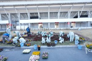 物販ブースの建設が進む中、グランドスタンド前に私たちが授業でデザインした花壇を草花で表現しました。