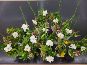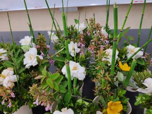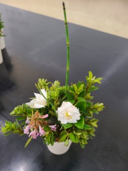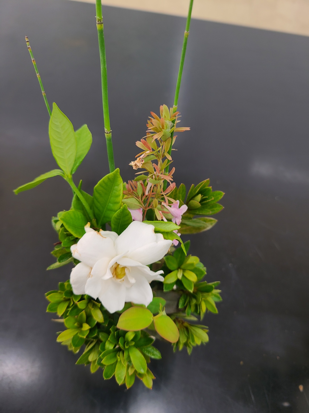 生活文化科食物経営コースでは、生物活用の授業でフラワーアレンジメントに取り組みました。校庭の植物(クチナシ、サツキ、トクサなど)を使って、お金をかけずに作品をつくりました。クチナシは、甘い香りがして心を癒してくれます。身近にある自然を活かした個性的な作品が、たくさんできました。