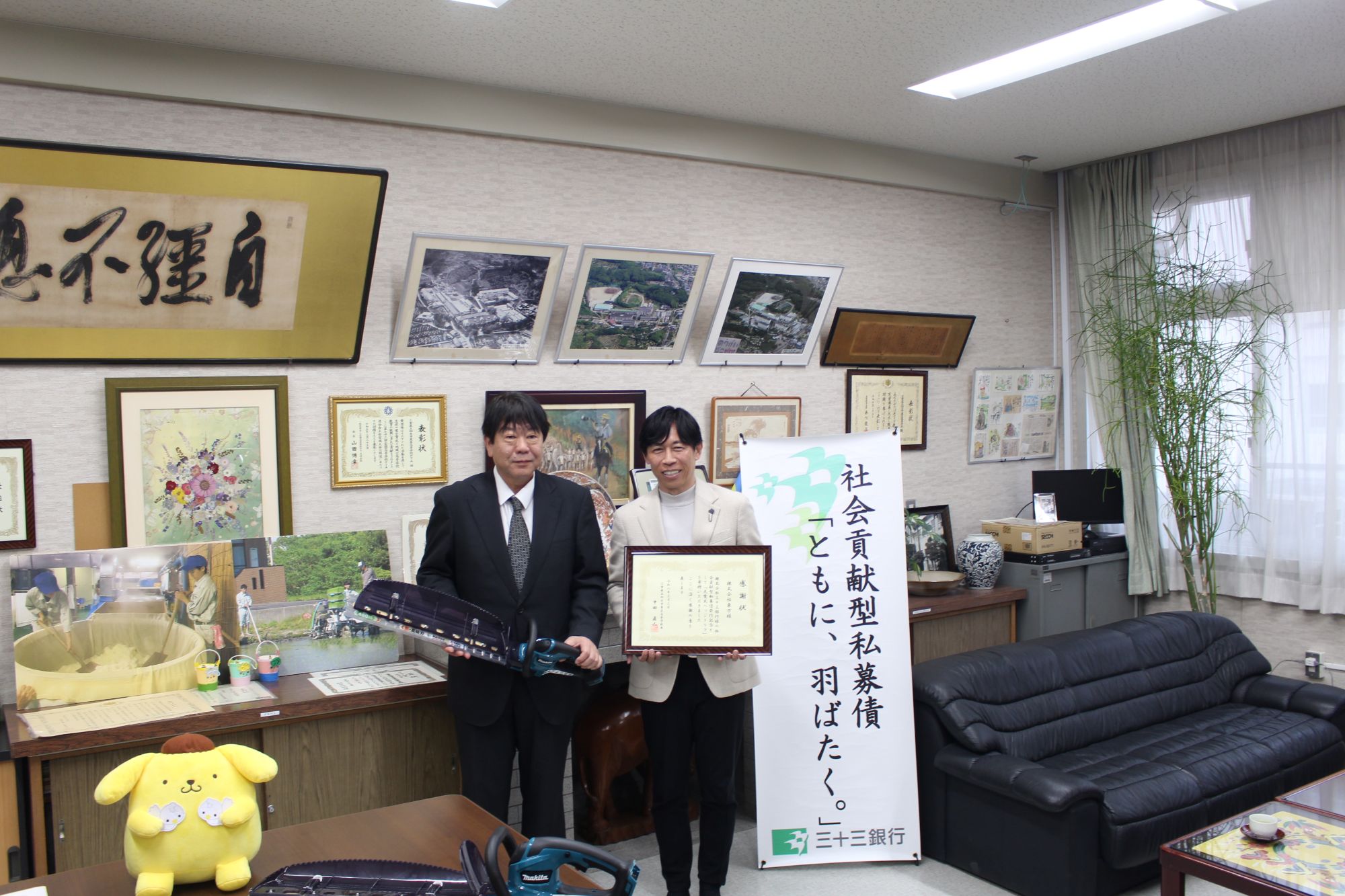 3月3日(火)、(株)東万様と三十三銀行様より、生垣の剪定に使用するコードレス電動トリマー(生垣の刈込を行う機械)を寄贈いただきました。本校にはコード式の電動トリマーはありましたが、延長コードをつないで電源を確保するのに苦労していて、今後は場所を選ばず剪定実習ができます。また機械自体も軽量で、近年は女子生徒も多く、作業の負担を減らすことが出来そうです。