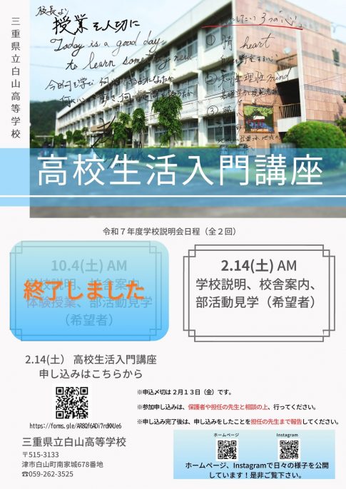 更新情報 令和7年度三重県立白山高等学校冬季学校説明会(ご案内)2026.01.093学期始業式2026.01.08図書館より 1月新着図書2026.01.082学期表彰式・表彰伝達式・生徒会報告・終業式2025.12.25防災避難訓練・防災教室2025.12.25 過去のお知らせはこちら 白山高校について 白山高校学校案内 パンフレットもダウンロードできます。 キャリア教育の紹介 地域のPR活動やインターンシップなど、特色ある学びを紹介します。 学校生活の紹介 学校行事やクラブ活動を紹介します。 お知らせ・ブログ 日々の活動はブログをご覧ください。 お問い合わせ 交通アクセスはこちらです。 白山高校ブログ・インスタグラム 令和7年度三重県立白山高等学校冬季学校説明会(ご案内)2026.01.093学期始業式2026.01.08図書館より 1月新着図書2026.01.082学期表彰式・表彰伝達式・生徒会報告・終業式2025.12.25防災避難訓練・防災教室2025.12.252学期クラスマッチ!2025.12.25薬物乱用防止教室2025.12.25歯科講話2025.12.25 . 福祉類型の3年生が能登半島地震の . 1月4日(木)、「令和5年度三重 . 新年、あけましておめでとうござい . 𝑀𝑒𝑟𝑟𝑦 𝐶ℎ𝑟𝑖𝑠𝑡𝑚 . 12月22日(金)表彰式、終業式 Instagram でフォロー