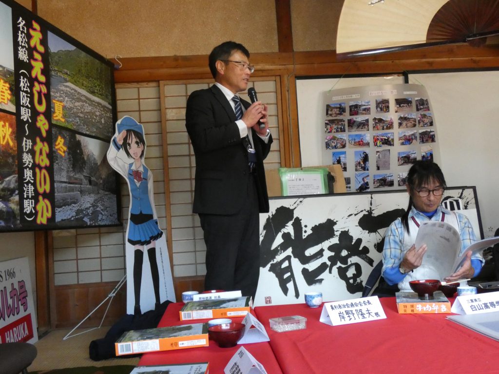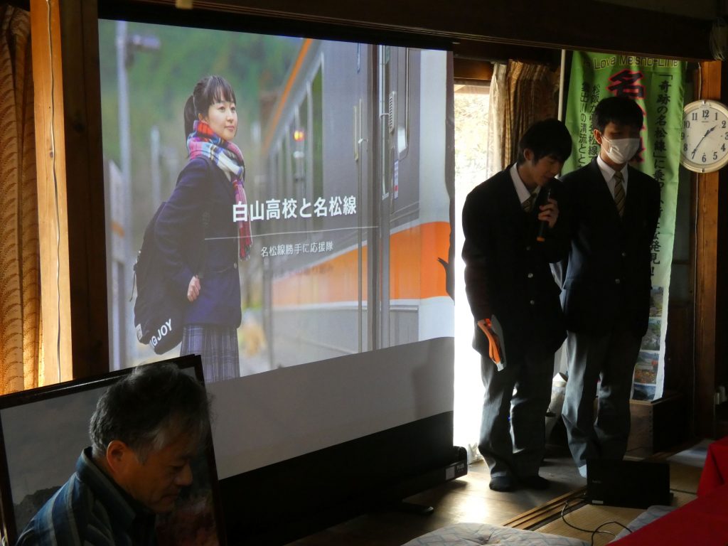 伊勢奥津90周年イベント 記念式典終了後に、かわせみ庵にて「昼食と感謝の会」が開催され、白山高校生徒会長鈴木君、副会長宮村君と、2年生総合的な探究の時間「白山学」にて名松線のことを探究しているチームから、青木さん、山口さんが参加しました。この会には津市長様はじめ 大井川鐡道代表取締役社長 鳥塚亮様、若桜鉄道代表取締役社長 上川 元張様、日本鉄道マーケティング 山田様など、多くの方々が参加され、鉄道の今後について、語り合う場でした。その中で、本校生徒が「白山高校と名松線の関わりについて」というテーマにて取り組みの成果を発表する機会をいただきました。会に参加された皆様は、過去のポスタープロジェクト活動など、生徒たちの発表に深く興味を示していただき、大変好評でした。