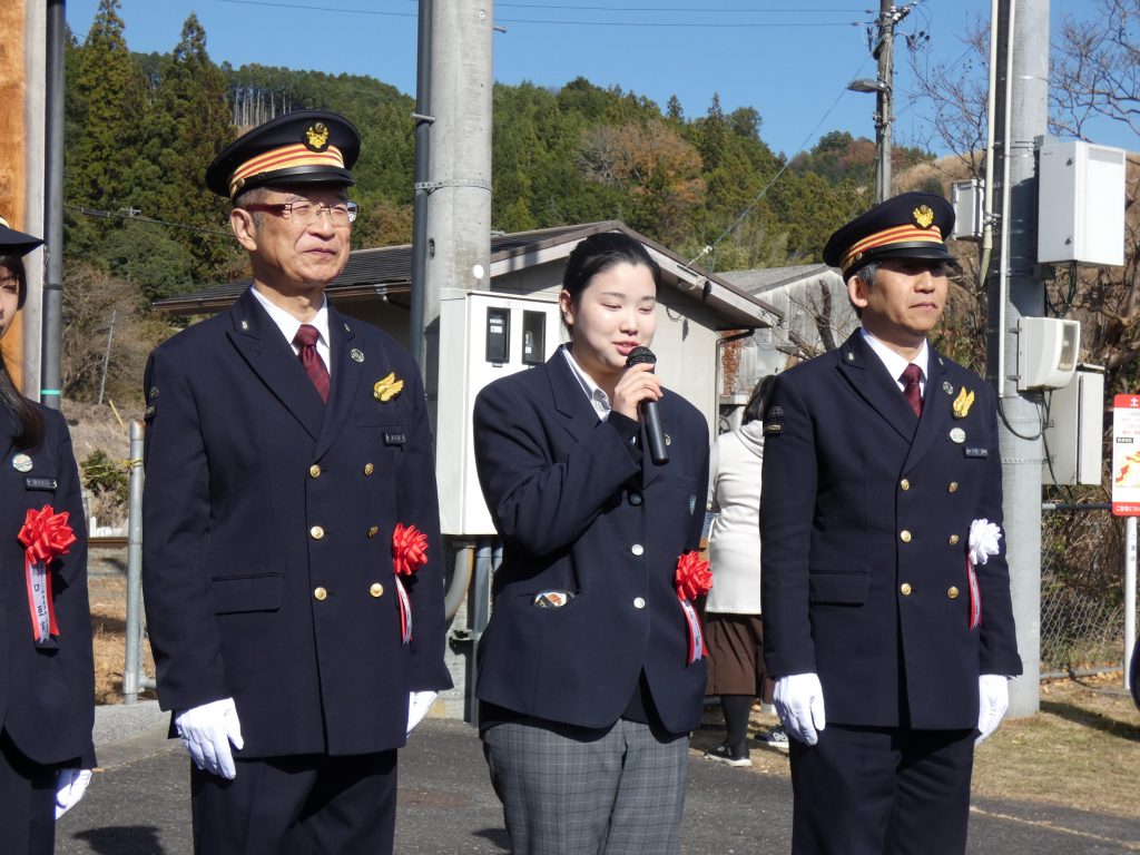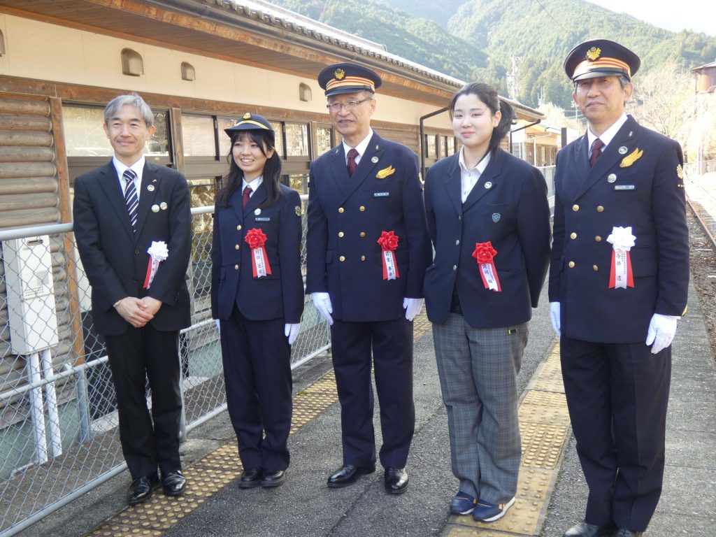 このイベント中に、名松線開業90周年を記念した記念ヘッドマークがお披露目され、ヘッドマークをデザインしてくれた2年1組北岡さんが、津市長様、JR東海 東海鉄道事業本部運輸営業部営業担当部長様、松阪駅長様、津市クイーン川口様とともに、記念式典に参加しました。