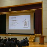 避難完了後の体育館では、三重県教育委員会事務局 教育総務課の方をお招きし、「大災害が起こった時に正しく判断できる人に」というテーマで防災教室を開催しました。