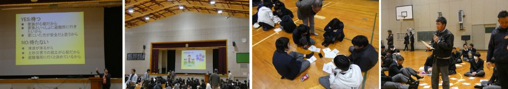 後半はグループワークを行いました。 「一人で家にいる時に大きな地震が起きた。あなたは家族が帰ってくるまでその場で待つ?」などの具体的な問いに対し、自分の考えを「YES」か「NO」で示し、その理由を話し合いました。