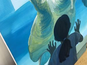 現3年生が2年生の時に各コース(ビジュアルデザインコース、服飾デザインコース、美術コース〔油彩画、日本画、彫刻〕)の授業で制作した作品の展示