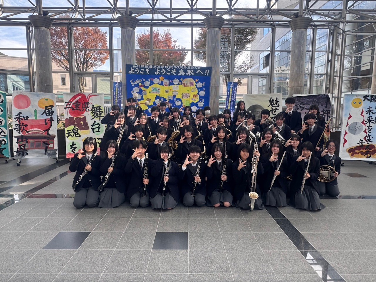 11月23日(日)に開催された「第45回近畿高等学校総合文化祭鳥取大会」の吹奏楽部門に三重県代表として出場させていただきました。2,000人を収容できる大きなホールでの演奏は緊張しましたが、入部して7カ月で大きく成長した1年生、部の中心として責任が芽生え始めた2年生、最高学年としての安定感抜群の3年生、それぞれの強みが発揮され、いな総らしい温かく明るいサウンドで素敵な演奏を披露することができました。会場まで聴きに来てくださった関係者の皆さま、本当にありがとうございました。