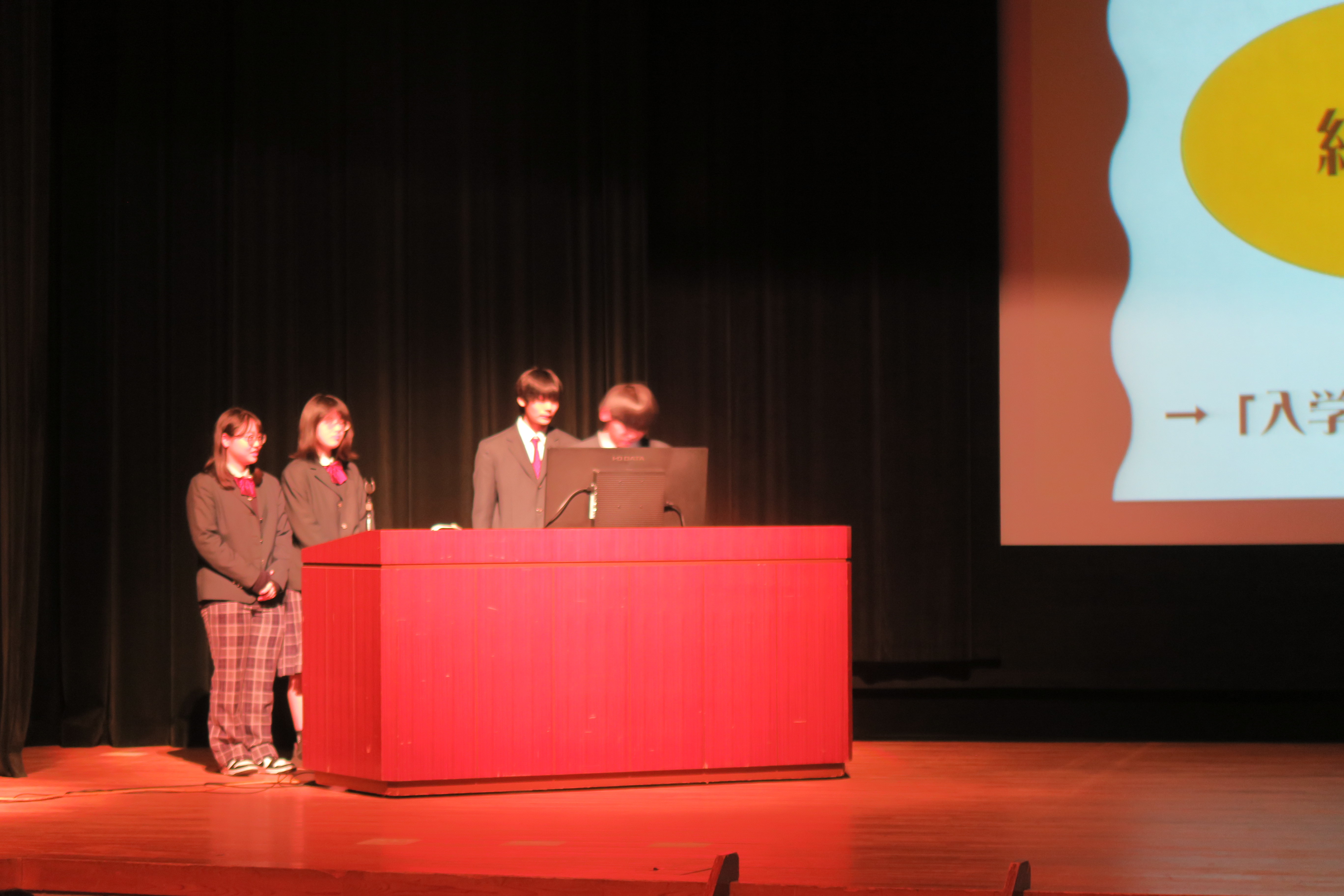続いて行われた壮行会では、バスケットボール部、ワープロ・情報部の代表生徒が紹介され、校長先生・生徒会から激励の言葉をかけていただきました。