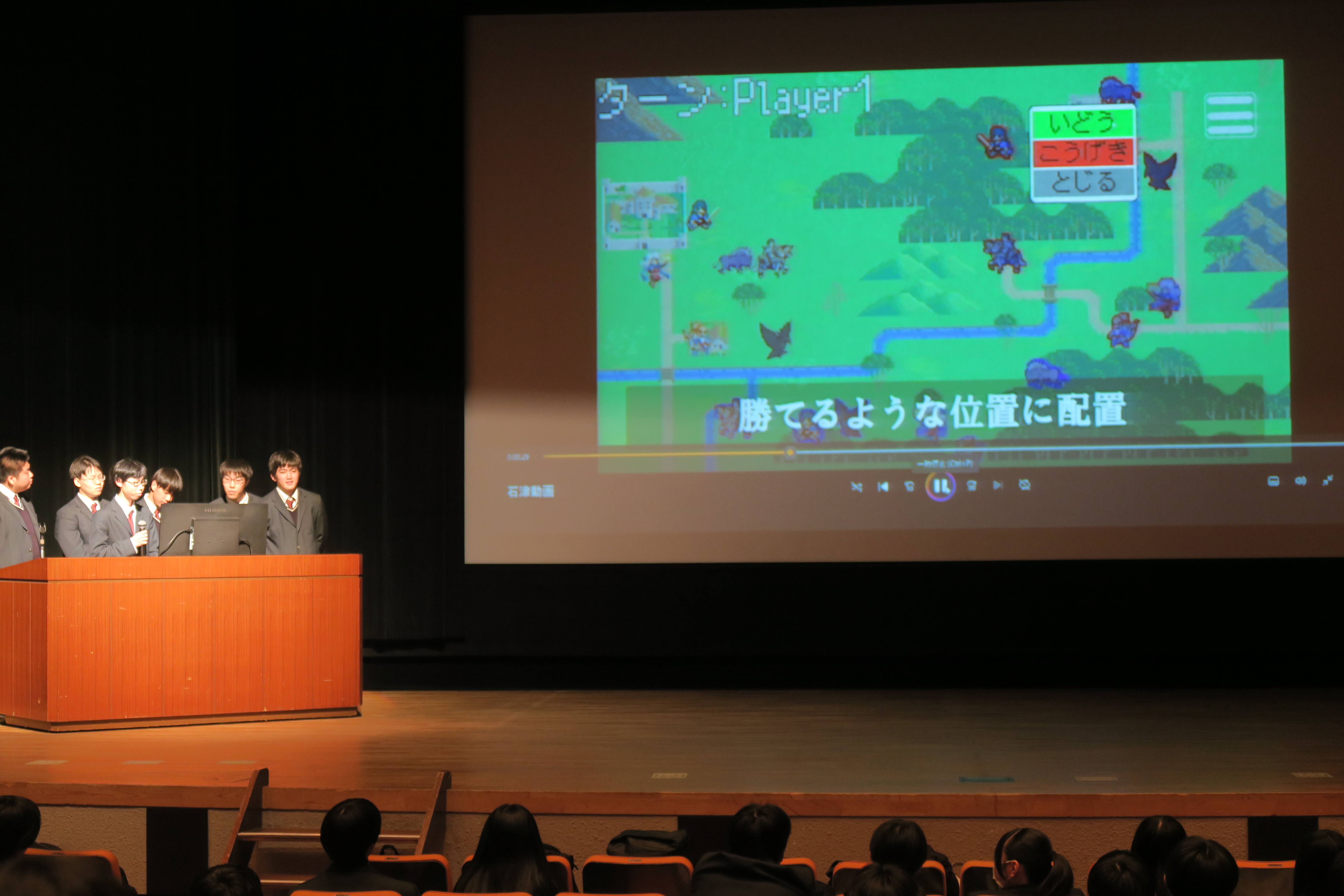 発表会の冒頭では、全国専門学科情報科研究協議会において発表を行った生徒による報告が行われました。その後、インストラクターA・B、広告制作、動画制作、プログラミング、ビジネスマナーの6講座が、それぞれ1年間の学習成果を発表しました。