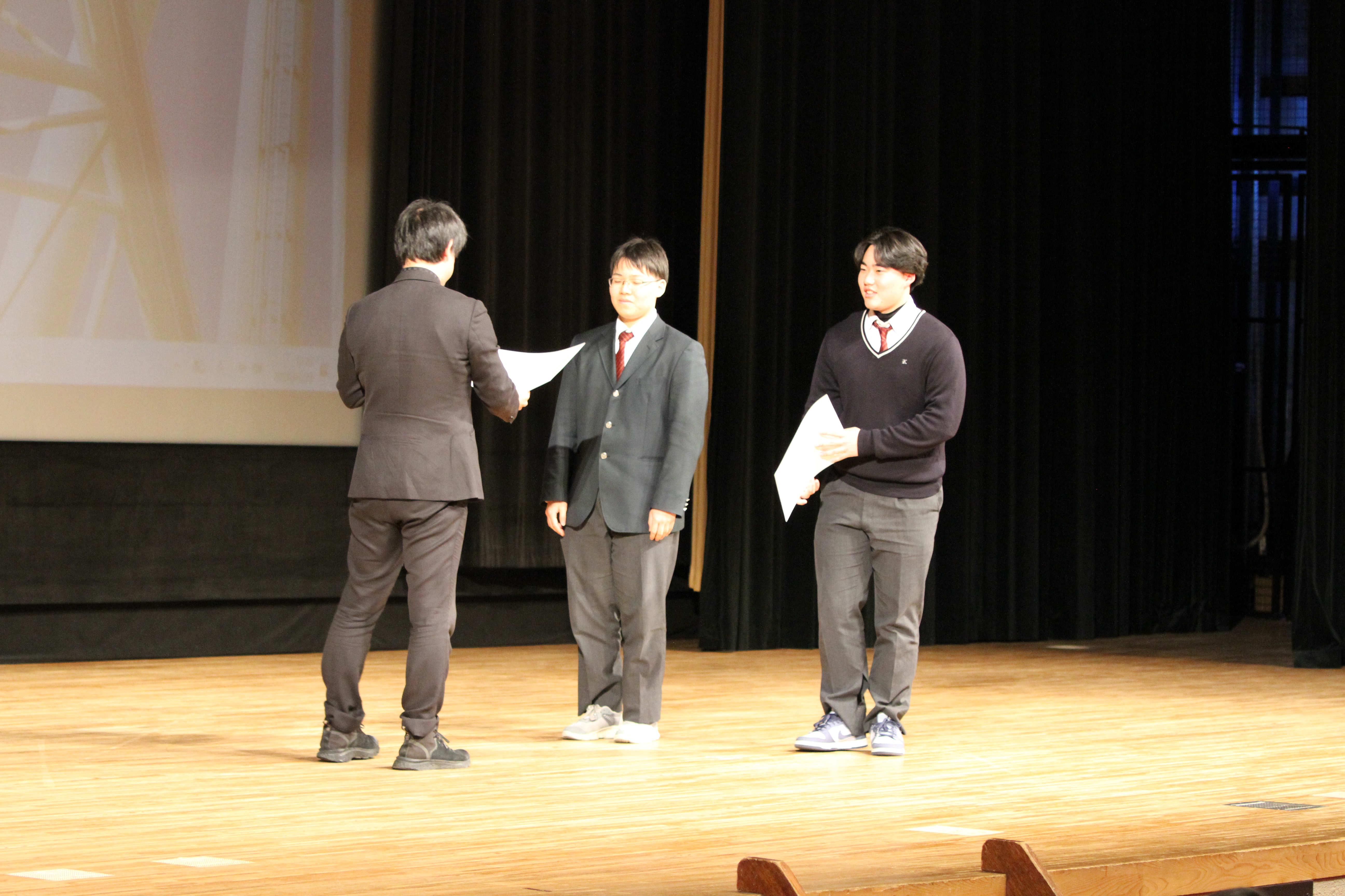 続いて行われた2学期終業式では、校長先生より2学期を振り返り、日々の学習や学校生活で積み重ねてきた経験を次につなげていくことの大切さについて講話がありました。また、生徒指導講話では、生徒指導主任より冬休みの過ごし方についての話があり、生活面や安全面について意識を高める時間となりました。