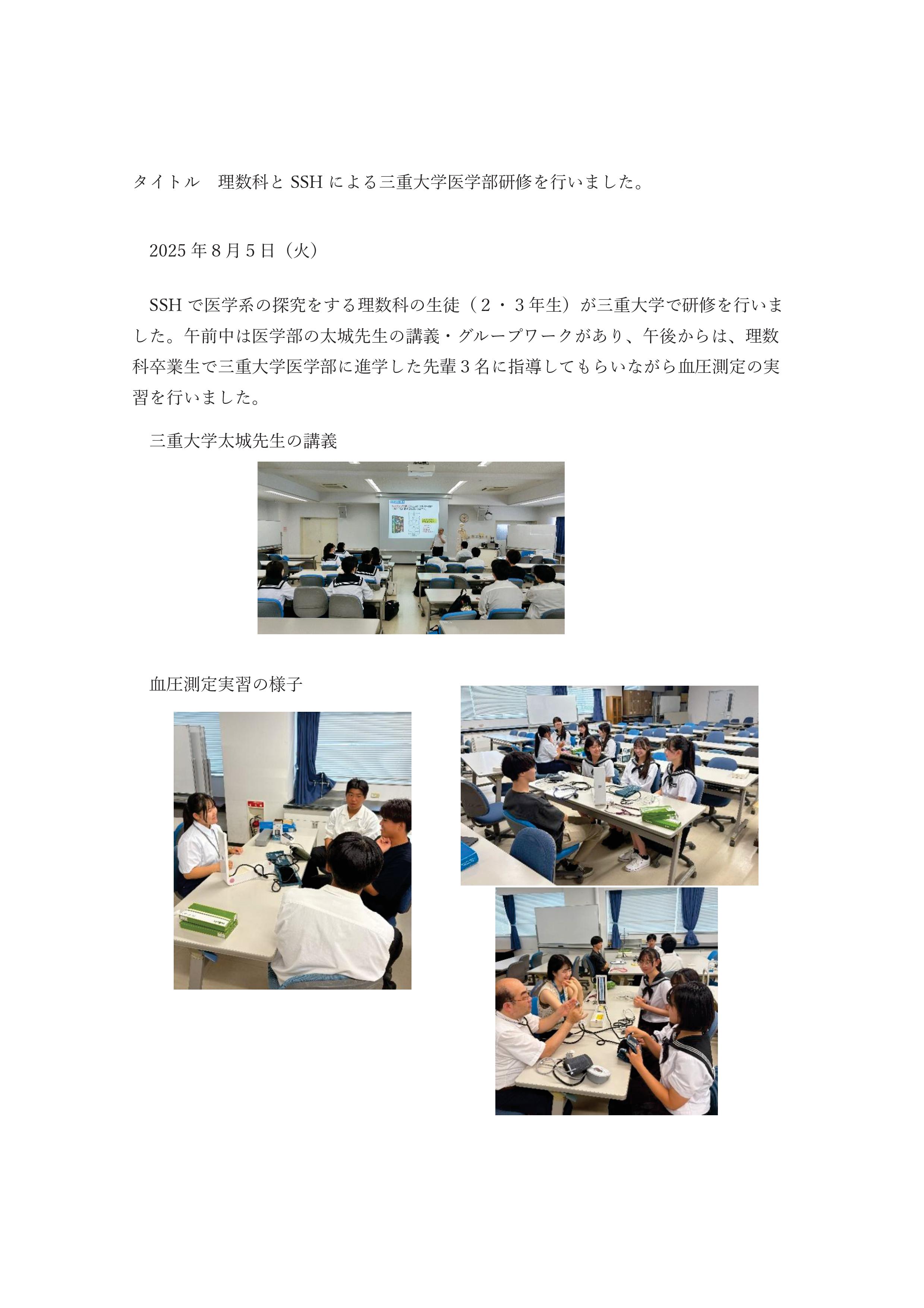 SSHで医学系の探究をする理数科の生徒(2・3年生)が三重大学で研修を行いました。午前中は医学部の太城先生の講義・グループワーク、午後からは、理数科卒業生で三重大学医学部に進学した先輩3名に指導してもらいながら血圧測定の実習を行いました。