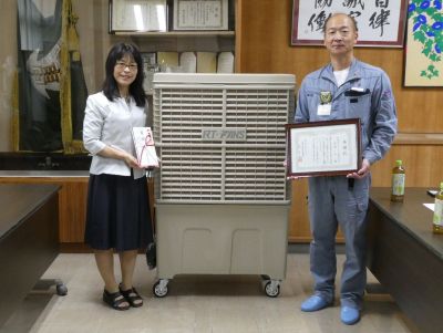 新報国マテリアル株式会社三重工場様から気化熱式冷風機2台を寄贈いただきました。本校の学習室や視聴覚室では備付エアコンの効きが長年の使用により非常に悪くなってきており、生徒からも「暑いのでなんとかなりませんか」といった声が聞かれていました。この度寄贈いただきました気化熱式冷風機は今後の本校生徒の教育活動に大切に使用させていただきます。ありがとうございました!