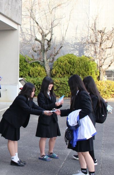 12月11日(木)、ボランティアに参加した2学年有志の生徒が、コンタクトレンズケース回収ボランティアのチラシ配布を行いました。ケースはリサイクル業者に買い取ってもらい、そのお金は、視力障がいのある方に寄付されます。また、コンタクトレンズケースそのものは自動車や家電製品の部品にリサイクルされます。この活動の呼びかけに、2学年の生徒18名が応募してくれました。今後も定期的に活動し、社会貢献していきます。