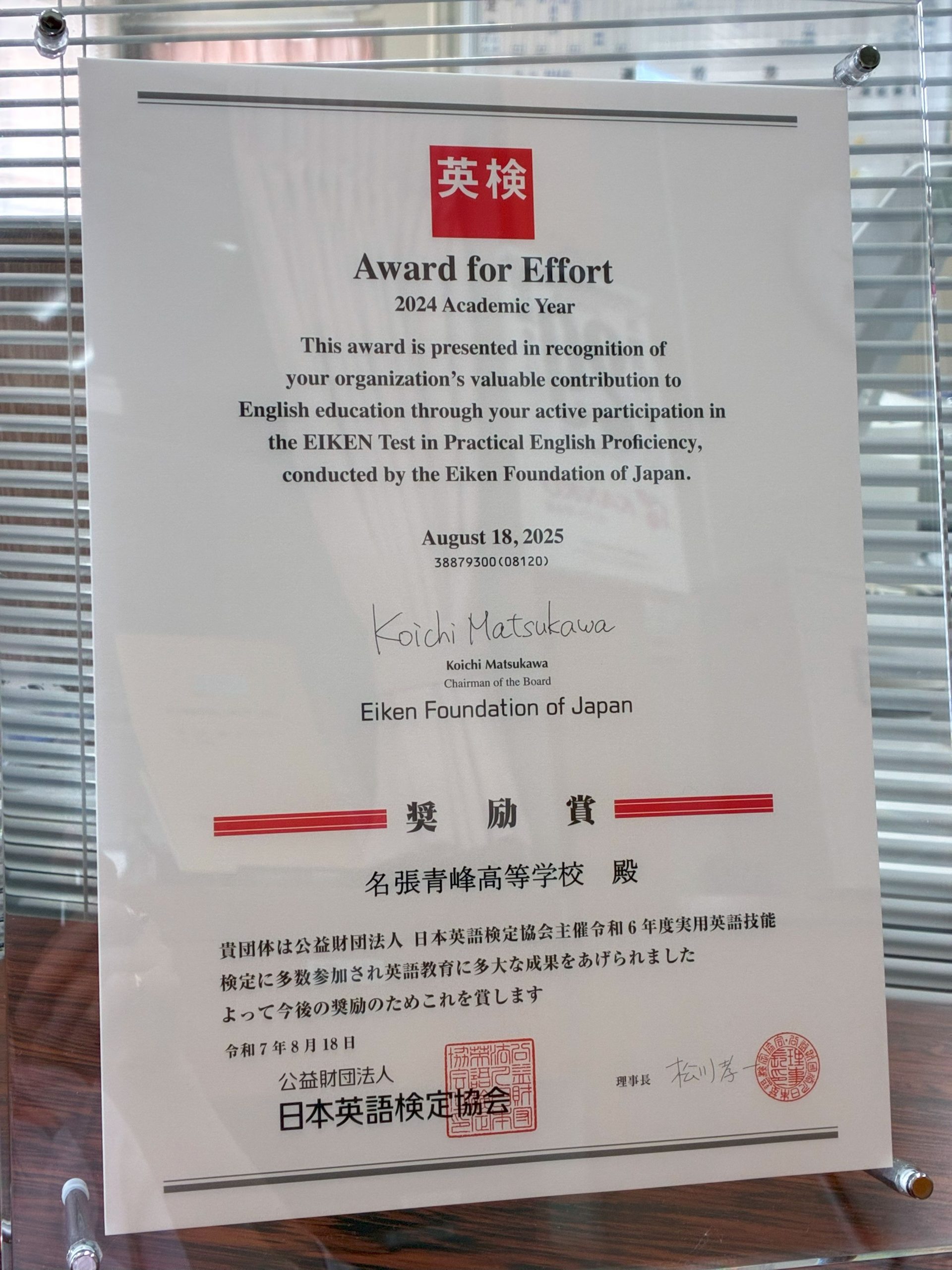 日本英語検定協会主催 実用英語技能検定の実施について、令和6年度成績優秀団体選考委員会にて、名張青峰高等学校が「奨励賞」に選出されました。
