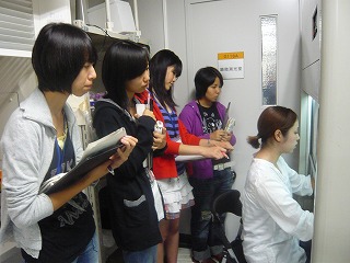 ◇午前中、細胞の培養の様子を見学させてもらったが、たいへん緻密な操作であった。今回は、時間の関係で私達は操作ができなかったが、機会があればやってみたい。使用したヒーラ細胞(50年間培養されているそうです)は、がん細胞であるため強いが、繊細で繁殖力の弱い細胞の場合は細心の注意を払われなければ簡単に死んでしまうらしい。午後は、光学顕微鏡の仕組みや光の性質、蛍光分子について講義を受け、細胞や微生物を観察した、新岡先生にわかりやすく説明していただいたので、楽しく理解することができた。特に、蛍光分子についての話は面白く、もっと詳しく聞きたいと思った。私は、生物を選択しているが、今回の研修で物理にも興味をもったので、自分で本を読んでみようと思った。