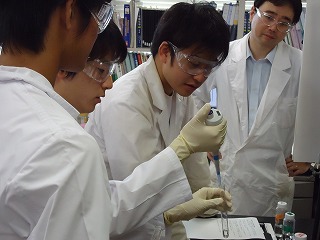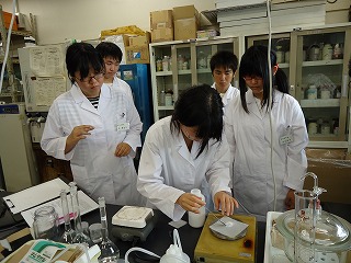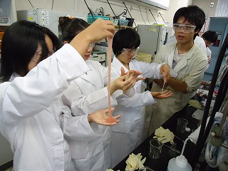 ◇午前中とは研究室の雰囲気も少し違っていました。酵素は一つの性質に特化していることがわかりました。ショ糖、ブドウ糖、果糖の違いも分からない状態で受けましたが、ショ糖を分解することでブドウ糖と果糖ができているということがわかりました。今日、私たちが研究室で行わせていただいたバイオリアクターという酵素など生体触媒を使った反応装置、インベルターゼという酵素は実際に工業で使われているという話を聞いて驚きました。工学部では反応だけでなく工業化も考慮した研究開発を学ぶという点にも興味を持ちました。ただ研究発表して終わりではなく工業、産業にもかかわってくるということがわかりました。何のために研究をするのか、研究をして社会に貢献することはるのかと、疑問を持っていた私にとっては今回の体験はとても印象に残るものとなりました。研究室の設備がとても充実しており、そこで研究されている人たちの独特の良い雰囲気を体験でき、自分もこのような大学で学べたらと思いました。