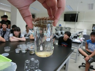 ・たくさん興味がわくような体験をしましたが、特にウニの発生実験では驚くことがたくさんありました。ウニの精子と卵が結びついて受精卵ができてそれが細胞分裂を繰り返していっていく光景はスゴく感動したし、びっくりしました。どんどん分裂が細かくなっていってたいへんおもしろかったです。夜遅くまでその反応をゆっくりみていっておもしろかったです。最後はウニが幼生になって動き回っている様子も顕微鏡で見ることができて、ずっと見ていたので少しずつ愛着がわいていきました。とにかく新たな生命の誕生はとても興味をかきたてられます。スゴく感動する内容でした。