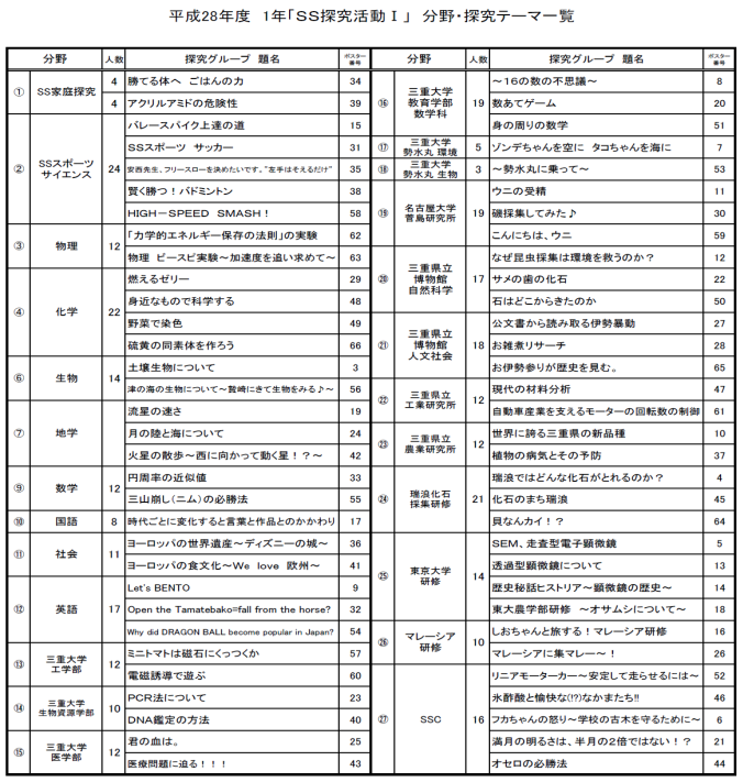 平成29年1月27日(金) 14:30〜15:45 津高校体育館にて1年生による探究活動の研究発表会が開催されました。 1グループ3〜7名で、全64グループによるポスター発表が行われました。この中から投票で選ばれた上位10グループと、 SSCは2月4日のSSH生徒発表会で発表し ます。(2017年2月3日 三重タイムズ記事)