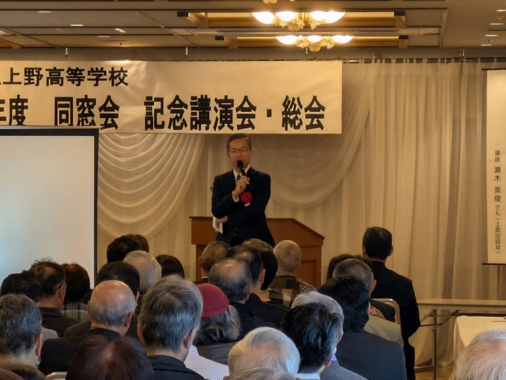 記念講演にはロート製薬株式会社代表取締役の瀬木英俊様(第32回卒)をお招きし、学生時代の思い出話からロート製薬で取り組んでこられた事業や社会貢献、現在の上野高校にいたるまで、ユーモアを交えつつ興味深いお話しをお伺いできました。