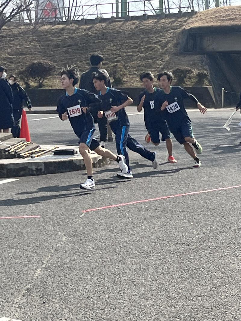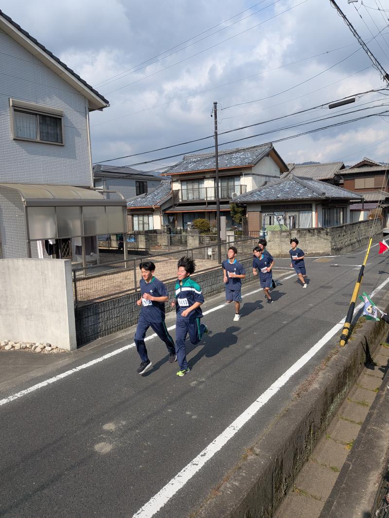 続いて男子の部。スタート直後から多くの生徒がスピード感のある安定した走りを見せる中、早い段階で2年生の2人が抜け出してトップ争いを展開し、その背中に1年生が食らいつく形となりました。後半では疲労との闘いを強いられながらも、上位を狙う者、完走を目指す者、それぞれが心の内に熱い闘志を燃やしたナイスランでした。最終的には2年生が意地を見せて1位と2位を獲得、3位には1年生が食い込んでフィニッシュしました。
