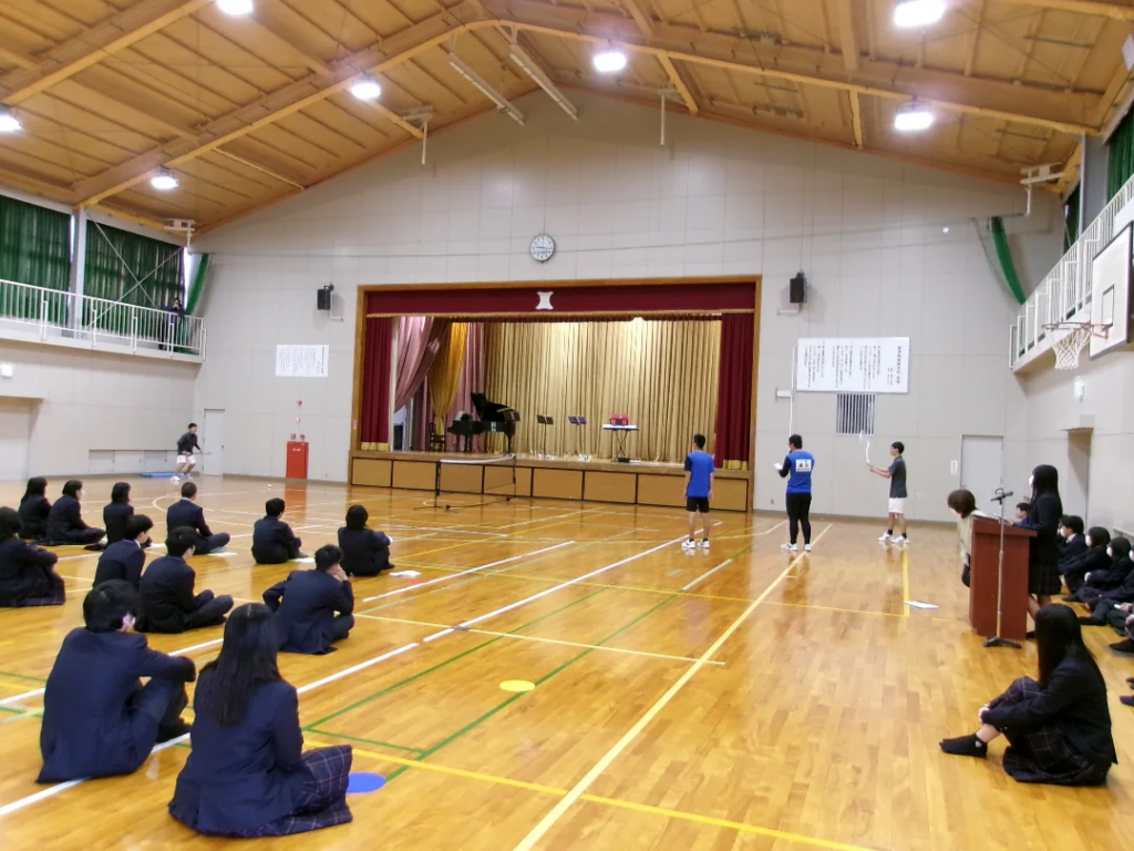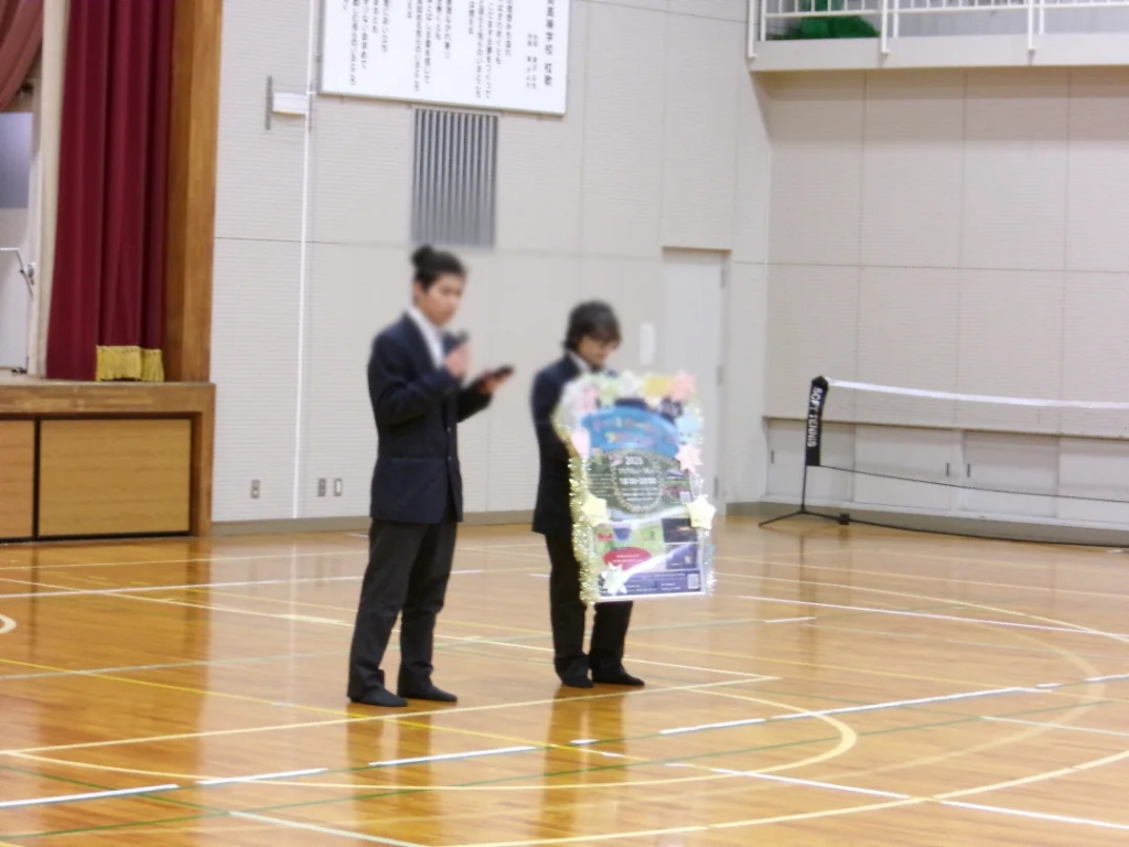 対面式では生徒会長の挨拶や、記念品が贈呈されました。