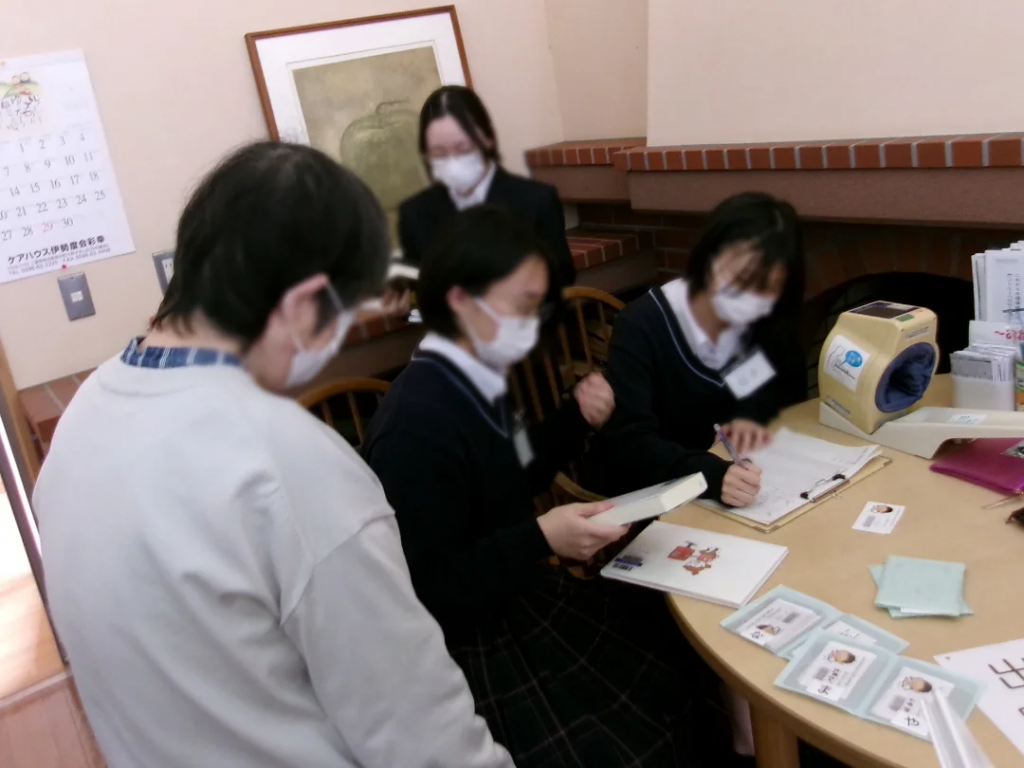2学年、ケアハウス伊勢度会彩幸さん班は、出前図書館を行いました。生徒、司書が事前に選んだ約40冊の本を持参し、たくさんの本を借りていただけました!