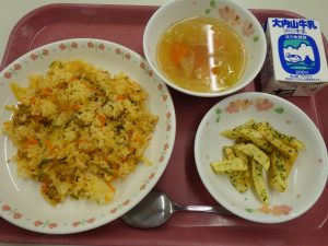 キムタクチャーハン、牛乳、のり塩ポテト、野菜スープ