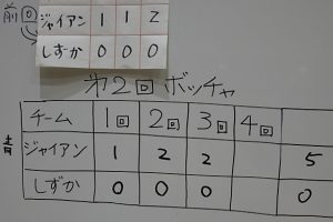 10月20日(月) 盲・聾合同の集いMAXで第2回ボッチャをしました。初めに前回と同じく盲・聾混合の女子と男子のチームに分かれて、それぞれのチームで投げる順番や作戦を話し合いました。女子チームは、前回負けたので気合いが入っていました。試合結果は、3回戦とも男子チームが勝ちましたが、みんな笑顔も多く楽しんでいました。