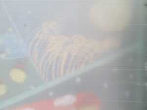 校内に、不思議な絵を見つけました。 写真1 段プレートから透けて、オレンジや黄色、緑や白などの色に塗り分けられた、大小の丸、長丸、四角形、縞模様などが見えます。写真2 こちらは、真ん中あたりに軽く弧を描くような黄色の縦線がたくさん並んでいます。
