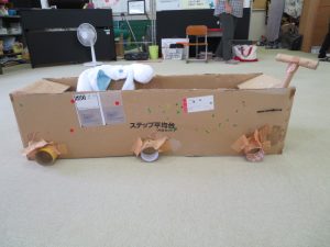 ほかにもいくつか光るものが飾られていました。すべてお友だちが飾ったそうです。 写真3 段ボールを横長につないで作った、上側が開いている直方体の右端に、同じく段ボールを丸めて棒状にしたものがついていてハンドルのようです。