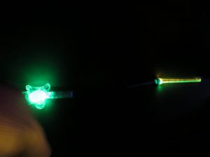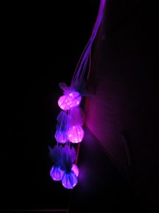 ひだまり教室(プレ幼稚部)にお邪魔したら、この日来ていたお友だちが、素敵な小部屋に誘ってくれました。 写真1 青紫に光る玉が10こくらい同じ色に光る線にぶら下がっています。 真っ暗な部屋の隅っこに天井から下げられていました。光だけが見えてとてもきれいです。写真2 緑色と黄緑色に光る星のようなものと横長の棒があります。 真っ暗な部屋の反対側の下のほうにおいてあって、やはり光だけがみえてとてもきれいです。