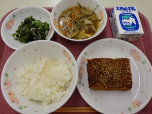 ごはん、牛乳、松風焼き、しらすときゅうりの酢の物、沢煮椀
