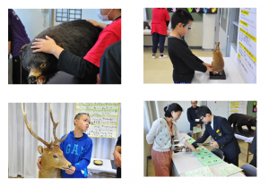 ふだん、博物館では、展示物になかなか触ることができません。今回特別に、触って観察できるように剥製や頭骨(シカ、クマ、ウサギなど)を盲学校内で展示してもらいました。同時に、盲学校の児童が調べてきた内容についての掲示物なども展示しました。