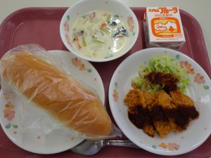 今日は食パンではないので自分でパンに切り込みを入れ、チキンカツとキャベツをはさんで食べてください。またはミルクチャウダーにパンを付けて食べてもよいです。チャウダーとは、フランス語で「大鍋で煮込む」という意味です。魚介類を使ったクラムチャウダーも有名です。給食のチャウダーは牛乳を使ったクリーミーなスープです。