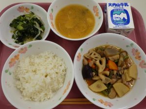 ごはん、牛乳、筑前煮、わかめの酢の物、白みそ汁