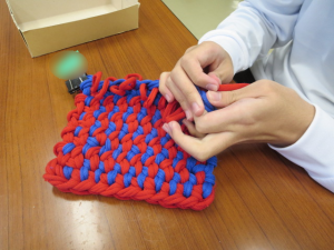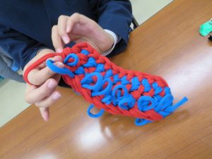 高等部の作業学習で作っている鍋敷きがこんな感じになっていました。 写真1 2とも大阪万博を思い出させるような、きれいな赤と青のひもを交互に編み上げています。 写真1 写真2 1学期のころに比べて、みんな本当に手早くすいすいきれいに編めるようになっています。 ゴールは11月8日(土)の本校文化祭、完成品を展示する予定です。みなさん見に来てくださいね。