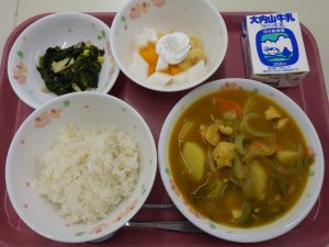 ごはん、牛乳、☆鶏肉のスープカレー、ほうれん草のソテー、☆甘い楽園(杏仁フルーツ)