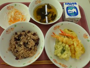 今日は三重盲の106回目の創立記念日です。お祝いの気持ちをこめた特別メニューです。古代より赤い色には邪気をはらう力があるとされ、その後お祝い事には赤飯を炊く風習が広がりました。給食ではもち米と普通の米を半々にし、小豆を入れて炊いています。紅白なますも人参の紅色と大根の白色の紅白が縁起の良い色合わせとなっています。天ぷらもお祝いの時によく食べられる料理です。