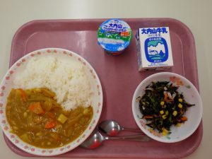 大豆とツナのチーズカレー、牛乳、ひじきサラダ、大内山ヨーグルト