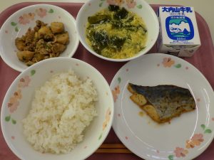 ごはん、牛乳、さわらのみそマヨネーズ焼き、☆里芋と豚肉のピリ辛煮、かき玉汁