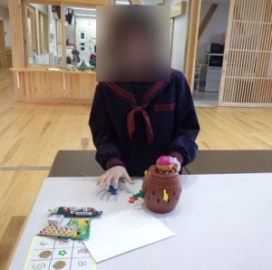 12月10日(水)水曜活動で「ウォークラリー デ ビンゴ」を行いました。聾学校の職員の好きな食べ物や2階に置いてあるゲームを聞いたり、傘立てにさしてある傘以外の物を当てたり、8つのミッションをクリアしてビンゴを目指しました。縦、横のビンゴが揃うと1個ずつミニお菓子を貰い、最終ミッションは黒ひげ危機一髪ゲームでした。ビンゴの後は、一緒にお菓子を食べて楽しく過ごしました。