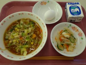 みそラーメン、牛乳、ゆでたまご、イカと大根の酢の物