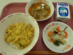 衣笠丼、牛乳、かぶのゆず漬け、豚汁