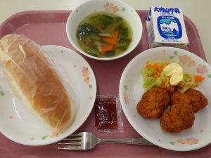 パンは自分でちぎったり開いたりしてジャムを付けて食べてください。カレーナゲットは三重盲で初めてのメニューです。鶏肉で作る手作りナゲットは出たことがありますが、今日はそこにみじん切りにした高野豆腐とカレー粉を加えています。高野豆腐が加わることで鉄分とカルシウムがアップしています。