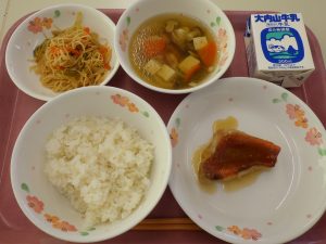 ごはん、牛乳、赤魚の煮付け、ビーフン炒め、五目汁