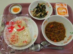 今月は卒業生のリクエストメニューがたくさんあります。ナンとキーマカレーのセットは理療科のTさんからのリクエストです。これは9月の「大阪・関西万博給食~インド~」で登場したメニューです。その時ナンは三重盲で初登場でした。そしてその日、Tさんは学校をお休みされて食べられずにとても残念だったことから今回リクエストしてくれました。ナンは好評だったので今回また食べられて嬉しいですね(^^)。