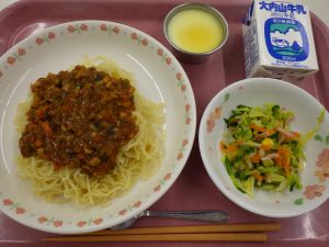 今月は卒業生のリクエストメニューがたくさんあります。ジャージャーめんは小学部のKさん、手作りプリンは普通科のKさんからのリクエストです。どちらも人気のメニューです。好きなものがありすぎてリクエストを選ぶのが大変だった様子の小学部のKさん、その中でジャージャーめんを選んでくれたのは納得です。プリンも皆に喜ばれるデザートです。
