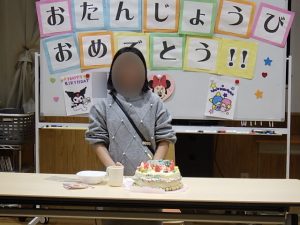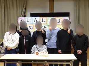 2月16日(月)20時~20時半まで、今年度最後の盲・聾合同の誕生会を2階学習室で行いました。今回、盲舎生は、飾り付けを担当し、聾舎生は、司会、ピアノ伴奏、おやつ係を担当しました。「ハッピーバースデー」を歌ってお祝いをして、おやつを食べながら一人ひとりお祝いの言葉を言って、和やかに過ごしました。最後は全員で記念写真を撮りました。