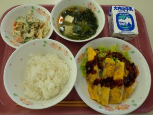 今月は卒業生のリクエストメニューがたくさんあります。ポークピカタは小学部のKさんからのリクエストです。豚のロース肉に薄力粉を薄くまぶし、パン粉と牛乳を加えた溶き卵にくぐらせ、オーブンで焼きます。お皿に盛り付けてケチャップソースをかけたらできあがりです。ごはんによく合うおかずです。