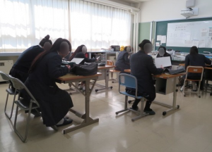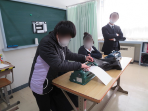 初めてパーキンスや点字に触れる津商業の生徒の皆さんに、わかりやすく説明するのに苦労していましたが、 津商の皆さんからも、わからないことを質問したり、「できました」と言葉に伝えてくれたりするなど、 お互いに少しずつやり取りのコツをつかんでいました。 写真4 点字用紙を正しくセットできているかどうか、一人一人の席を回って確認しています。